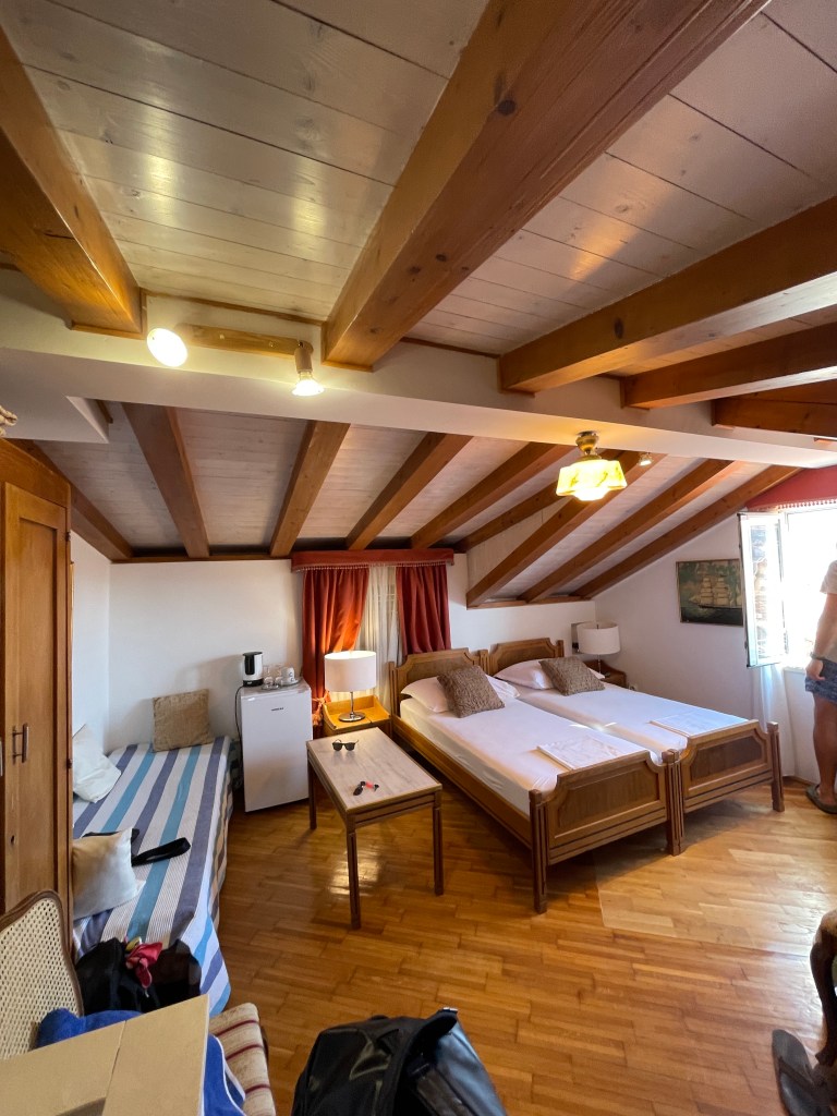 We stayed in an air bnb – Villa Ragusa – at the very top of old town hosted by Pero. Pero is a fantastic host and is really at the top of the host game. We had a penthouse room which had views over the entirety of Dubrovnik old town, honestly it couldn’t be beat. The room was just over €100 a night, with 3 single beds, AC, ensuite, wifi and had a suitable amount of space. Very good value for the location and time of year. FYI Dubrovnik is full of steep steps and this apartment is at the top of full flight and then three more to reach our room!