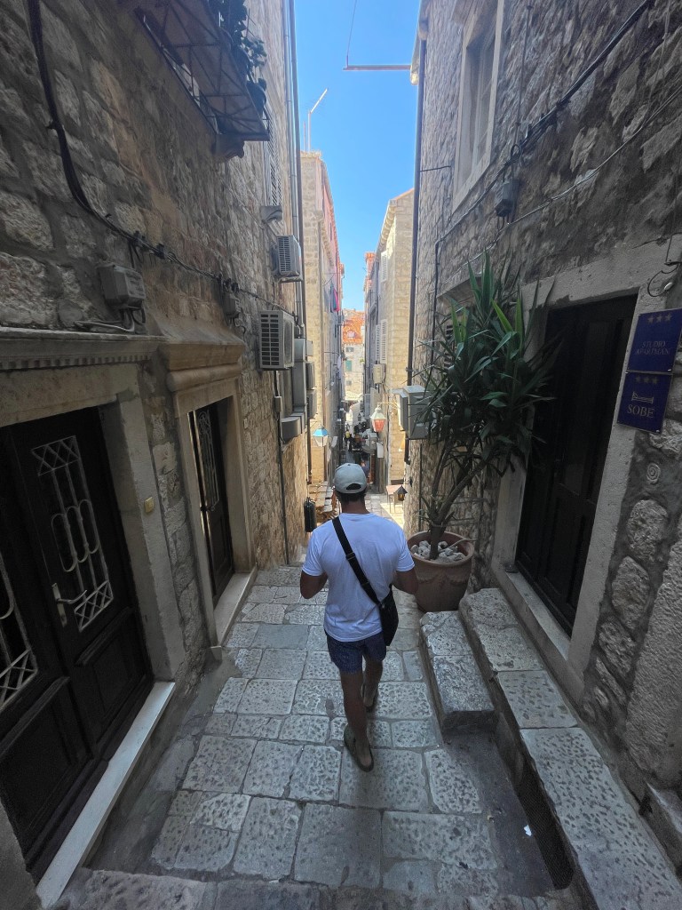 I booked “Rooms Tomic” which was €80 for one night. Located on the east side of town, roughly 15 minutes’ walk from the port. A really quaint, quiet, traditional stone house which hosts a stunning court yard. The room had a double bed, wifi, great AC and was the perfect place for our one-night stay. Sam and I aren’t the smallest lads you’ll ever meet, and the the double bed held us both fine. The house is located at the beginning of a rising hill so it’s not a terror walking back from town. There is no on sight parking here.
