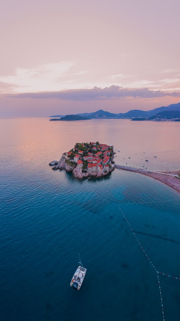 This magical destination is the perfect way to relax, soak up the sun and watch the sun set. Sveti Stefan is a pink rock beach with clear water at the base of an islet.